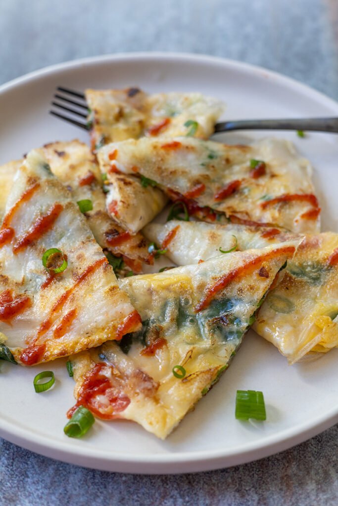Täytteet: Lisää kevätsipuli, pinaatti, tomaattisiivut ja juustoraaste.